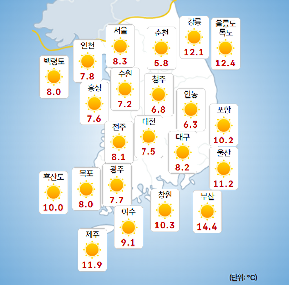 부산지방기상청에 따르면 이날 오전 9시 현재 주요 지역의 기온은 부산 14.4도, 울산 11.2도, 창원 10.3도로 기록됐다.