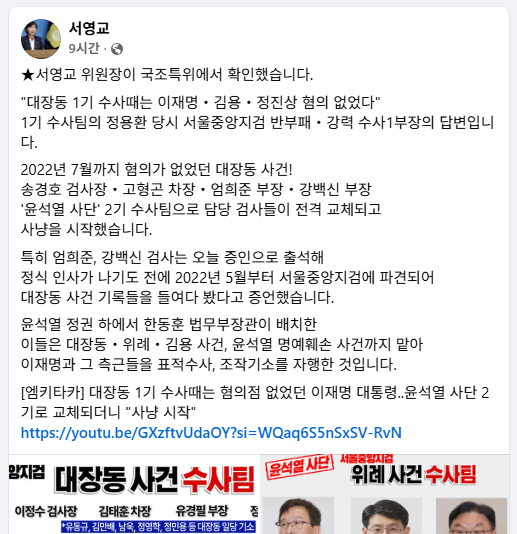 서 위원장은 또 페이스북에 "2022년 7월까지 혐의가 없었던 대장동 사건, 송경호 검사장과 고형곤 차장, 엄희준 부장, 강백신 부장 등이 '윤석열 사단' 2기 수사팀으로 담당 검사들이 전격 교체되고 사냥이 시작됐다"고 주장했다.