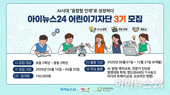 [아이뉴스24 김재환 기자] 아이뉴스24 경기취재본부는 학생들의 실전 취재 경험을 디지털 포트폴리오로 축적하고 장학생 선발까지 연계하는 '어린이기자단 3기'를 운영한다고 8일 밝혔다.
