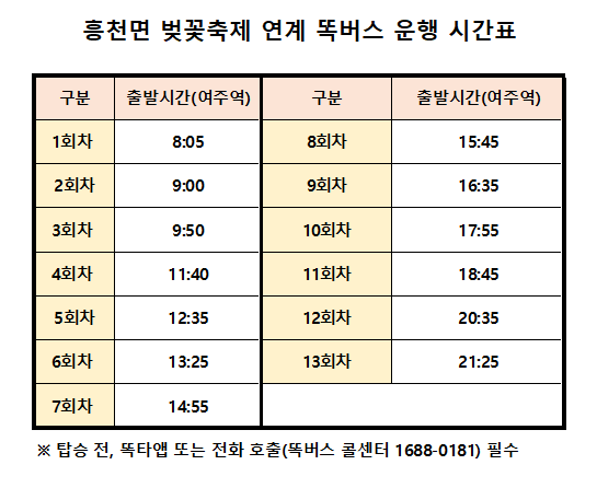 이충우 시장은 "흥천 남한강 벚꽃축제는 매년 수많은 인파가 몰리는 여주의 대표 축제인 만큼, 방문객들이 교통 불편 없이 축제를 즐길 수 있도록 특별 운행을 마련했다"며 "특히 여주역에서 바로 연결되는 똑버스를 편리하게 이용해 즐거운 봄나들이 즐기시길 바란다"고 말했다.