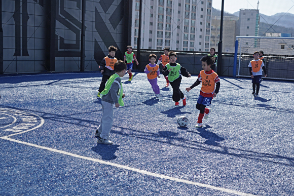 지난달 7일 달성 어린이 스포츠 교실 첫 활동. 이주배경·비이주배경 아동들이 축구 경기를 즐기고 있다 [사진=달성군]