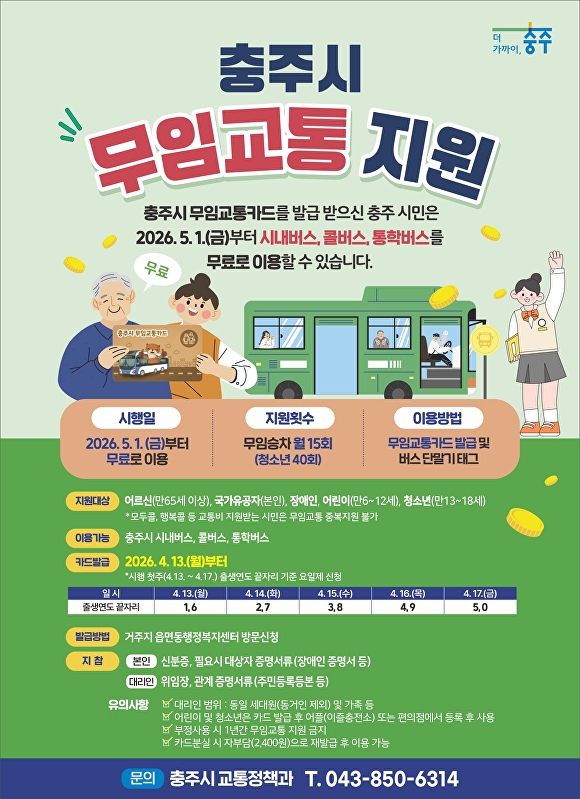 류명화 충주시 교통정책팀장은 “무임교통 지원이 시민들의 자유로운 이동권을 보장하고, 경제적 부담을 덜길 바란다”고 말했다.