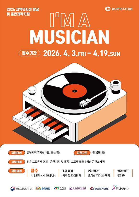 충남콘텐츠진흥원은 충남음악창작소를 통해 충남 지역 뮤지션을 위한 ‘I AM A MUSICIAN’ 프로젝트를 2026년에도 추진한다고 9일 밝혔다. 이 사업은 지역 뮤지션의 경쟁력을 높이고 충남 뮤지션이 국내·외 시장에 진출할 수 있도록 돕는 데 초점을 맞췄다.