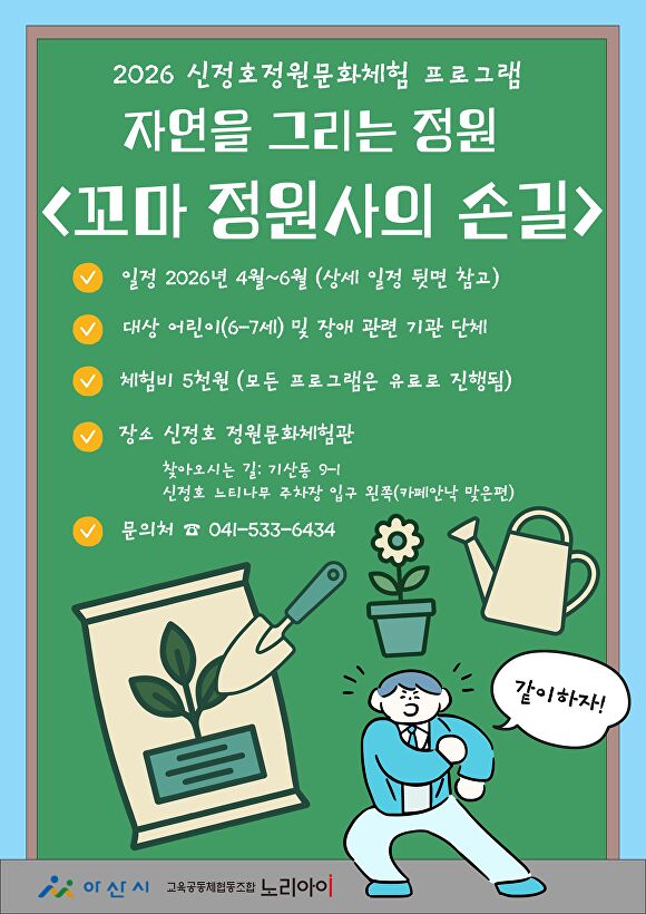 [아이뉴스24 정종윤 기자] 아산시가 충남 첫 지방정원인 신정호정원에서 유아와 장애인 단체를 위한 상반기 정원문화체험 프로그램을 운영한다. 단순 관람을 넘어 정원 속에서 만들고 배우는 체험형 프로그램을 통해 신정호정원의 활용 폭을 넓히겠다는 구상이다.