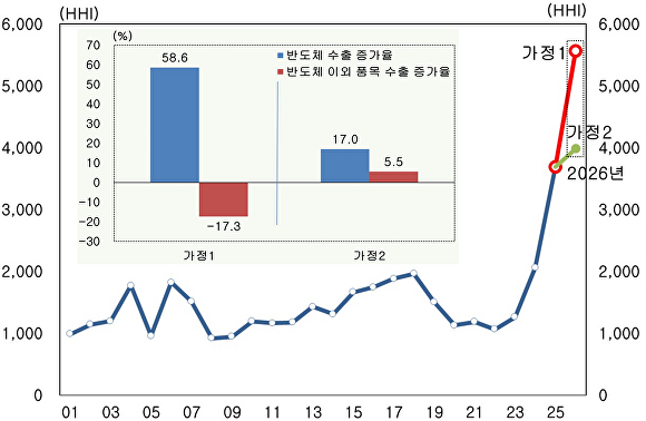 반도체 수출이 2023년 79억4000만달러에서 2025년 203억5000만달러로 156.2% 증가하는 동안 반도체 이외 품목의 수출은 199억1000만달러에서 134억7000만달러로 줄어들었다.