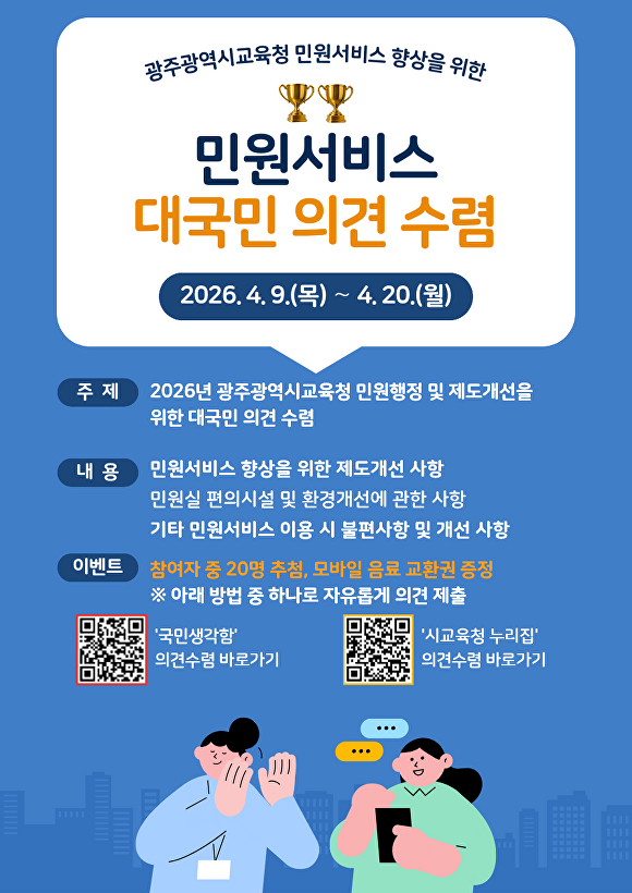 이번 의견 수렴은 국민의 다양한 목소리를 민원행정과 제도개선에 반영해 광주교육 민원서비스 만족도를 높이기 위해 마련됐다.