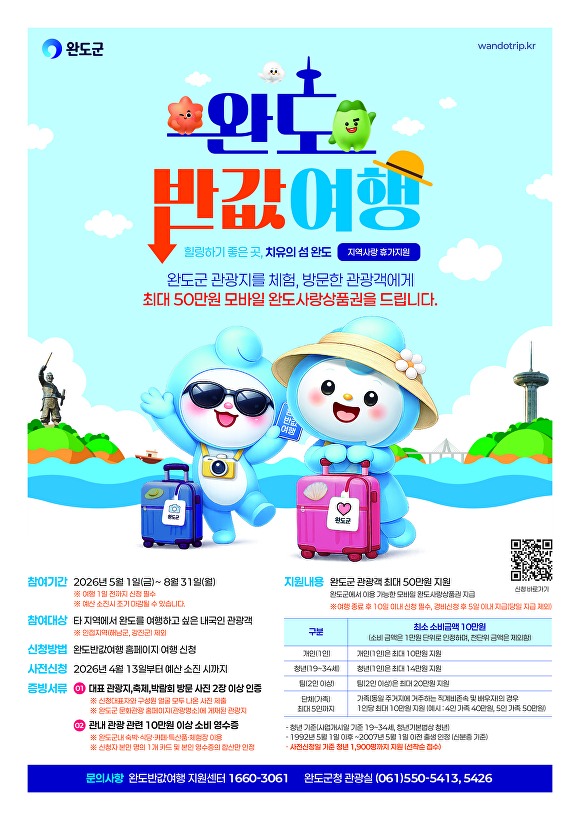 실제로 이번 ‘완도 반값 여행’은 숙박부터 식사, 체험, 특산품 구매까지 여행 전반에서 지출한 비용의 50%를 완도사랑상품권으로 환급해 주는 파격적인 혜택을 담고 있다.