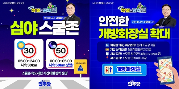 [아이뉴스24 이용민 기자] 더불어민주당이 심야 시간 스쿨존(어린이 보호구역) 속도 규제 완화와 민간 건물 화장실을 개방하는 내용의 공약을 내놨다.
