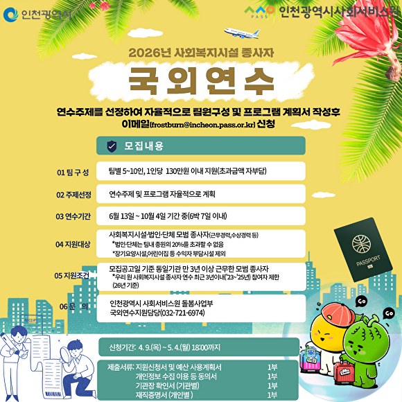 신청은 전자우편으로 접수하며 자세한 사항은 인천시사회서비스원 홈페이지에서 확인하거나 전화로 문의 가능하다.
