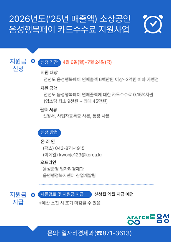 지원 금액은 전년도 음성행복페이 연매출액에 대한 카드수수료 0.15%에 해당하는 금액이다. 1개 업체당 최대 45만원까지 지원된다.