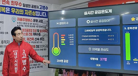 [아이뉴스24 이창재 기자] 고병수 대구시의원(남구 제2선거구) 예비후보가 주민 참여형 정책 플랫폼 ‘공감온도계’를 앞세워 민심 공략에 나섰다. 공약을 일방적으로 제시하는 기존 방식에서 벗어나 주민 의견을 정책 우선순위에 직접 반영하겠다는 전략이다.