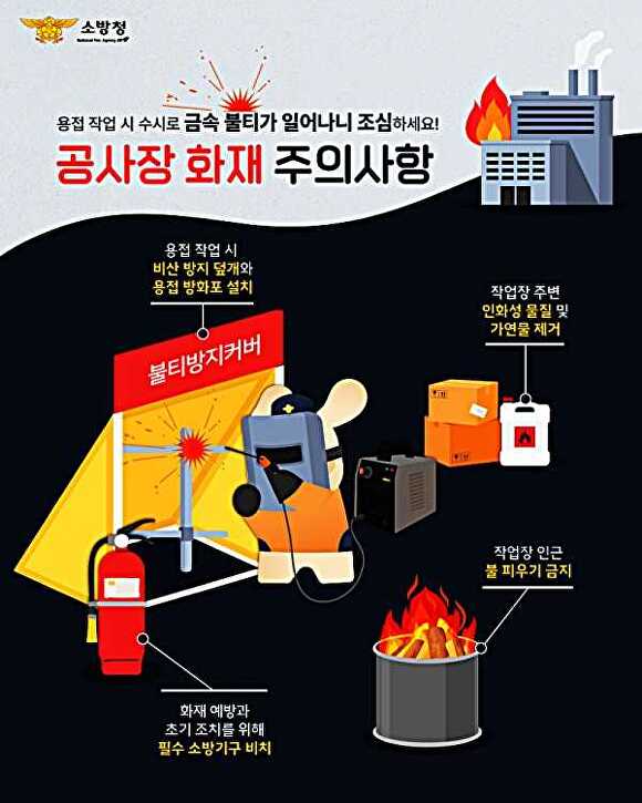또 작업 구역 분리, 불티방지커버 설치, 작업장 인근 화기 사용 금지, 작업 종료 후 잔불 확인 등 사후 점검도 철저히 이행해야 한다고 당부했다.