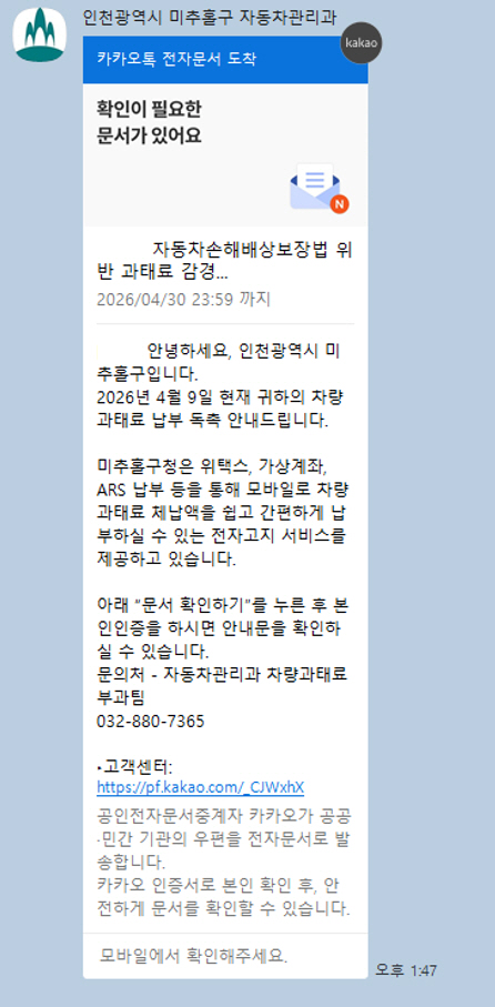 [아이뉴스24 김도은 기자] 인천 미추홀구가 오는 15일부터 자동차 의무보험 미가입 및 정기 검사 지연 과태료를 카카오톡으로 알려주고 바로 납부까지 가능한 ‘모바일 전자고지 서비스’를 시행한다.