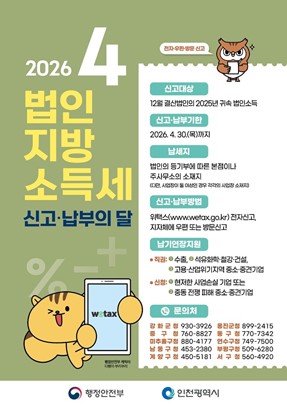 [아이뉴스24 김도은 기자] 인천시 중구가 4월 한 달간 ‘법인지방소득세 신고·납부의 달’을 운영한다.