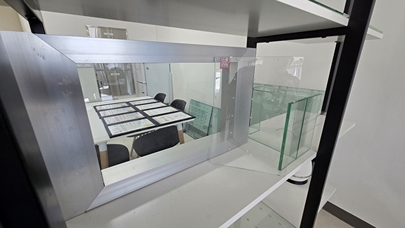 ㈜에이엠글로벌글라스의 고강도 화학강화유리 기반 ‘커튼월형 양면 탈부착식 투명 방음판’ 샘플. [사진=정재수 기자]