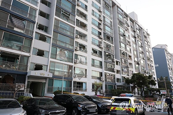 13일 청주시 흥덕구 봉명동 한 상가건물 내 식당에서 가스 누출 폭발 사고가 발생해 주변 아파트 창문이 깨지는 피해를 입었다. [사진=연합뉴스]