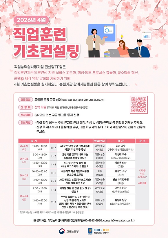 ‘4월 직업훈련 기초컨설팅’ 신청은 직업능력심사평가원 누리집이나 각 훈련기관에 배포된 리플렛·홍보 포스터의 QR코드를 통해 할 수 있다.