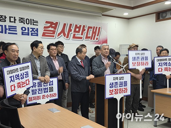 청주지역 16개 전통시장 상인회 임원 70여명은 14일 청주시청에서 기자회견을 열고 “대형유통시설 입점은 지역 전통시장과 소상공인 생존권에 직접적이고 심각한 영향을 미친다”며 “지역 전통시장 및 소상공인과의 상생을 위한 실질적 대책을 마련하라”고 청주시에 촉구했다.