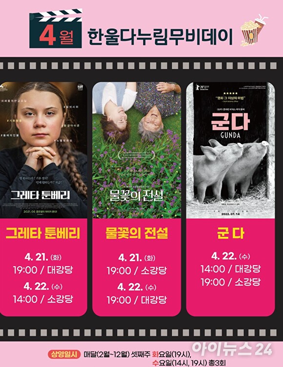 14일 한울본부에 따르면 오는 21일부터 이틀간 시행하는 4월 무비데이는 환경과 ESG 가치를 주제로 한 「그레타 툰베리」, 「물꽃의 전설」,「군다」를 상영한다.