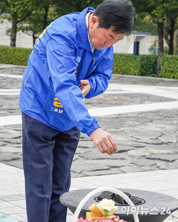 조 후보는 노무현 전 대통령 묘역을 참배하고 묵념하며, 오산시장 선거에 대한 승리를 다짐했다.