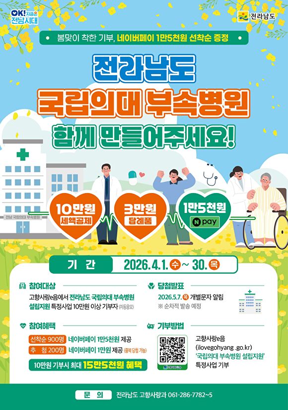 [아이뉴스24 대성수 기자] 전남도가 오는 30일까지 ‘국립의대 부속병원 설립 지원’ 지정기부 사업을 대상으로 고향사랑기부제 봄맞이 이벤트를 실시한다.