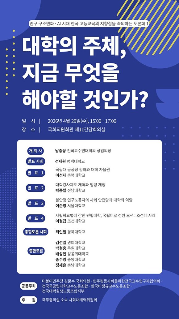 이번 토론회는 전국국공립대학교수노동조합, 한국비정규교수노동조합, 전국대학원생노동조합지부 등과 공동 주최로 진행되며, 국무총리실 소속 사회대개혁위원회가 후원한다.