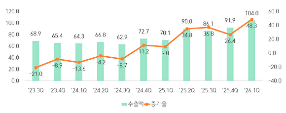 17일 한국무역협회 충북지역본부(본부장 김희영)가 발표한 2026년 1분기 충북 수출입동향에 따르면, 1분기 충북 수출액은 전년 동기 대비 48.3% 증가한 103억9698만 달러로 최종 집계됐다.