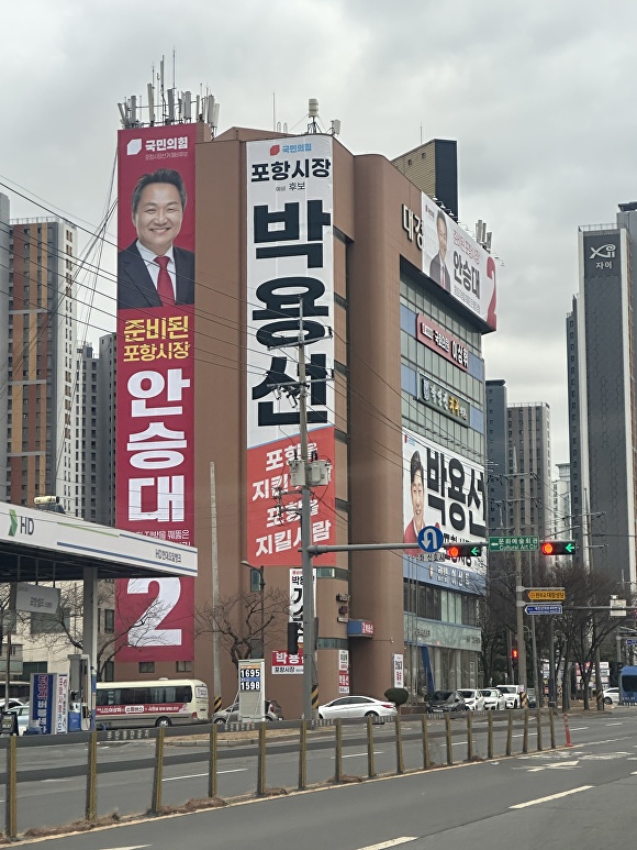 특히 남구 대잠동의 한 빌딩에는 국민의힘 포항시장 경선에서 최종 후보로 확정된 박용선 후보와 경선에서 탈락한 안승대 예비후보의 현수막이 같은 건물 외벽에 나란히 걸린 모습이 포착됐다. 동일 정당 소속 후보의 현수막이 한 건물에 동시에 게시되면서, 일반 유권자 입장에서는 누가 최종 후보인지 직관적으로 구분하기 어려운 상황이다.