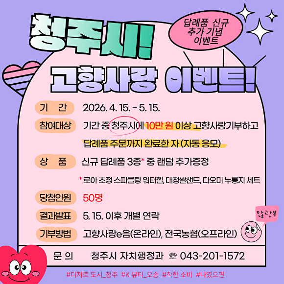 [아이뉴스24 안영록 기자] 충북 청주시가 오는 5월 15일까지 고향사랑기부제 참여자 중 50명을 추첨해 답례품을 추가로 준다.