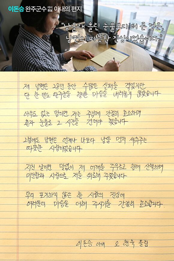 [아이뉴스24 김양근 기자] 더불어민주당 전북 완주군수 경선 결선 투표가 오는 20~21일 치러질 예정인 가운데, 이돈승 예비후보의 아내 오현숙 씨가 남편의 28년 외길 정치를 곁에서 지켜본 소회를 담은 손편지를 공개, 주위를 뭉클케 했다.