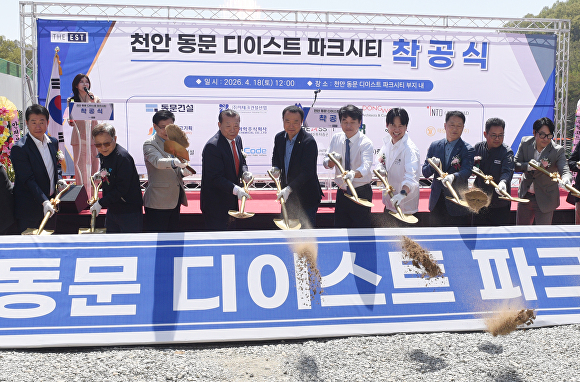 천안시 삼룡동 ‘동문 디이스트 파크시티’ 사업부지에서는 18일 착공식이 열렸다. 이날 행사에는 조합원과 관계자, 토지주, 지역구 국회의원, 동문건설 관계자 등 300여 명이 참석했다.