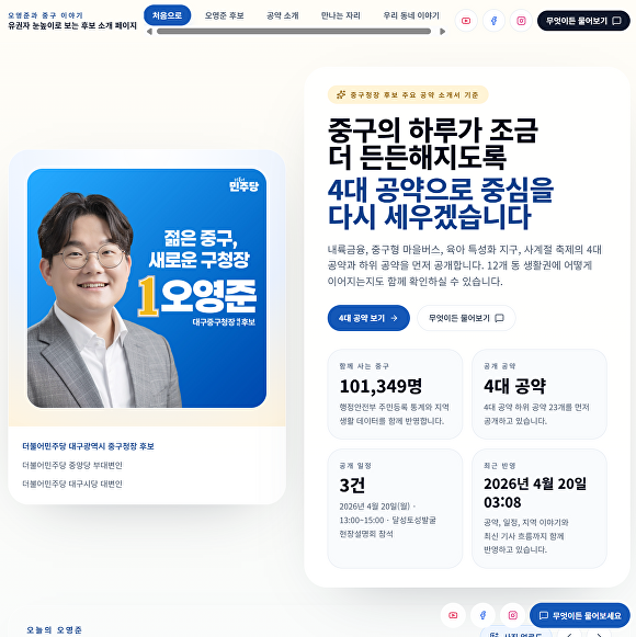 오영준 더불어민주당 대구 중구청장 후보가 20일 공식 홈페이지 ‘오영준.com’을 공개하며 AI·데이터 기반 선거운동을 본격화했다. 단순 홍보를 넘어 유권자가 직접 후보를 검증하는 ‘정보 플랫폼’을 표방한 점에서 기존 선거 문법을 흔드는 시도라는 평가다.