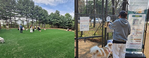 정발산 공원 내 새롭게 단장된 대형견 전용 반려견 놀이터와 연중무휴 24시간 안전하고 편리하게 시설을 이용할 수 있도록 입구에 설치된 'QR인증 기반 자동출입 시스템'. [사진=고양시]