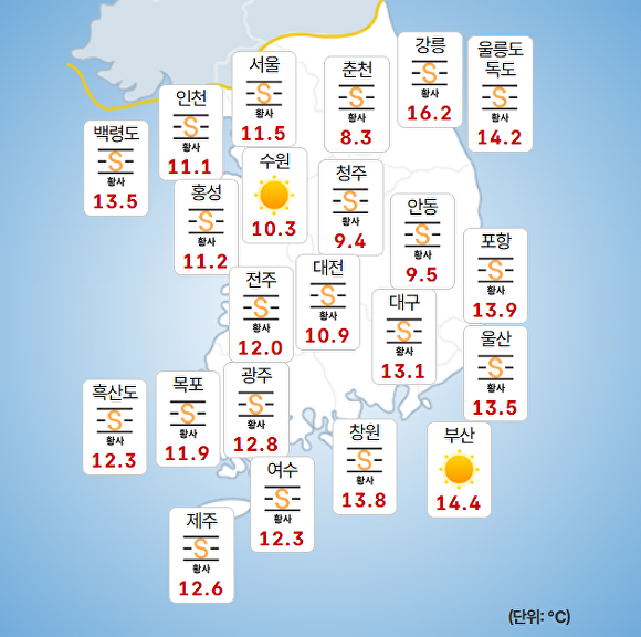 부산지방기상청에 따르면 이날 오전 9시 현재 주요 지역의 기온은 부산 14.4도, 울산 13.5도, 창원 13.8도로 기록됐다.