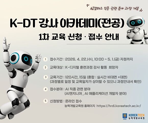 [아이뉴스24 박준표 기자] 한국기술교육대학교 능력개발교육원이 AI 분야 직업훈련을 맡을 교·강사 양성에 나선다. 정부의 AI 인재 양성 기조에 맞춰 산업현장에서 곧바로 활용할 수 있는 실무형 강사 풀을 넓히겠다는 취지다.