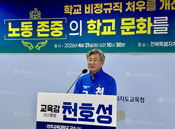 천 예비후보는 또 "명절휴가비, 급식비, 맞춤형복지비 등 각종 복리후생수당을 단계적으로 공무원과 동일 기준으로 지급하며, 휴가, 휴일 등에 대해 공무원과 비정규직 간 차별을 해소하도록 전국시도교육청 집단교섭에서 전북교육청이 앞장서겠다"고 강조했다.