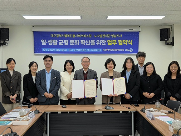 [아이뉴스24 이창재 기자] 대구시행복진흥사회서비스원과 노사발전재단이 일·생활 균형 문화 확산을 위해 협력 체계를 구축했다.