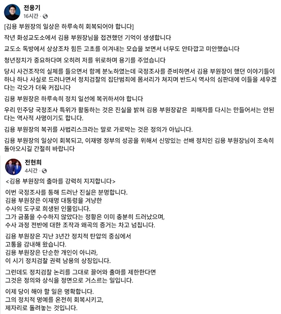 이들은 소셜네트워크서비스(SNS)를 통해 김 전 부원장은 ‘정치검찰의 조작 기소로 인한 피해자’로 규정하며 당이 먼저 명예회복의 기회를 줘야 한다고 주장했다.