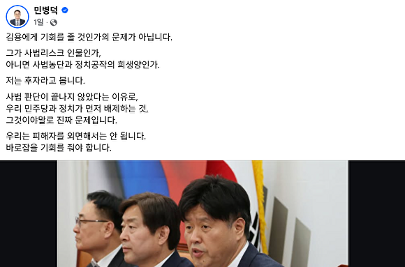 민 의원은 “김용에게 기회를 줄 것인가의 문제가 아니라 그가 사법 리스크 인물인지, 아니면 사법농단과 정치공작의 희생양인지의 문제”라며 “사법 판단이 끝나지 않았다는 이유로 당과 정치가 먼저 배제하는 것이야말로 진짜 문제”라고 강조했다.