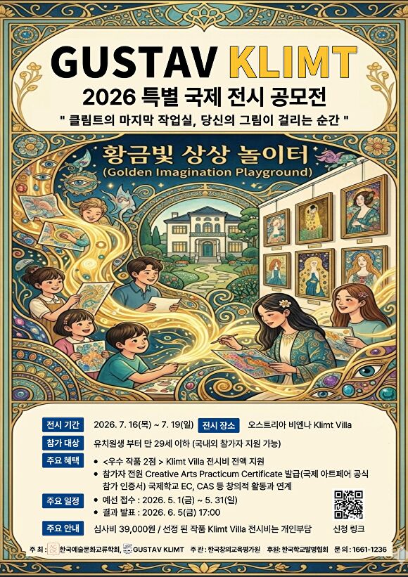 [아이뉴스24 김종국 기자] 한국창의교육평가원은 오스트리아 빈 크림트 빌라(Klimt Villa)에서 열리는 '2026 구스타프 크림트 특별국제 전시 공모전' 예선 접수를 내달 1일부터 시작한다고 밝혔다.
