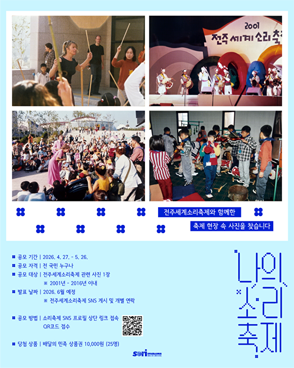 김정수 소리축제 집행위원장은 “이번 사진공모전은 관람객 여러분이 간직해온 소리축제의 소중한 순간들을 함께 나누는 자리”라며 “각자의 기억 속에 남아 있는 다양한 이야기들을 한데 모아 축제의 시간을 더욱 풍성하게 만들어주길 바란다”고 말했다.