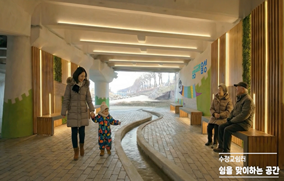 수정교 하부에는 주민 휴게공간과 작품 감상이 가능한 열린 갤러리를 마련하고, 벽놀이 교구 등을 활용한 어린이 놀이공간도 함께 조성된다.