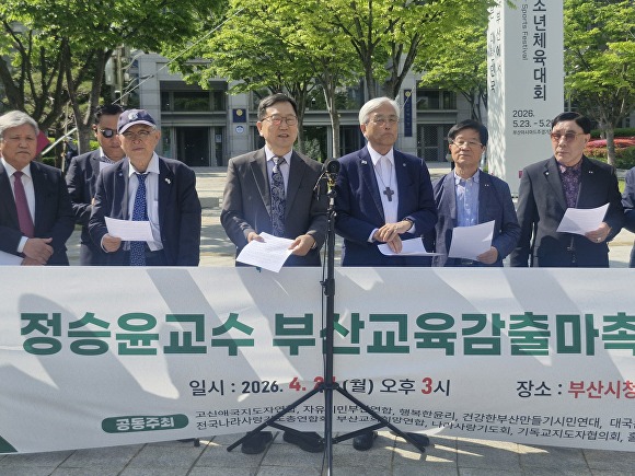 고신애국지도자연합, 자유시니부산연합 등 12개 단체는 27일 오후 부산시청 앞 잔디광장에서 기자회견을 열고 "부산시교육감 선거에 출마해 낙동강 전선에서 역사왜곡을 막고 자유민주주의 교육현장을 지켜달라"고 정 전 부위원장의 출마를 촉구했다.