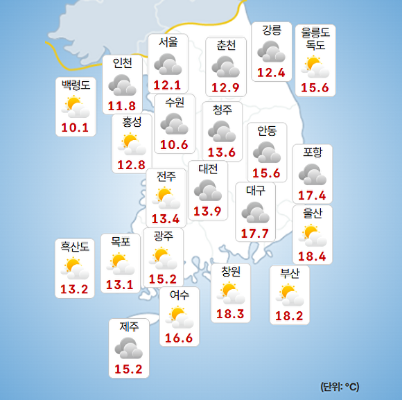 부산지방기상청에 따르면 이날 오전 9시 현재 주요 지역의 기온은 부산 18.2도, 울산 18.4도, 창원 18.3도로 기록됐다.