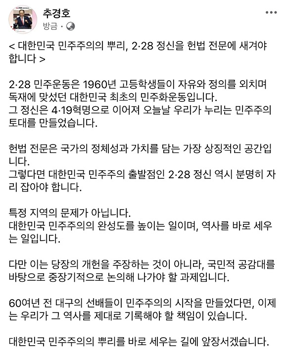 추 후보는 28일 자신의 페이스북을 통해 “대한민국 민주주의의 뿌리인 2·28 정신을 헌법 전문에 새겨야 한다”고 밝혔다.