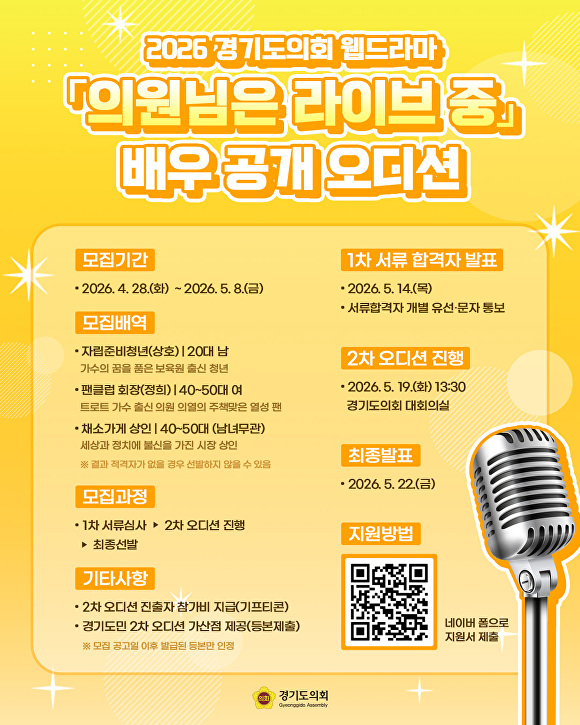 접수 기간은 28일부터 5월 8일까지이며 포스터 내 QR코드 또는 네이버 폼 링크(https://naver.me/FVFiM8qV)를 통해 신청할 수 있다. 자세한 내용은 경기도의회 웹드라마 인스타그램(@ggd_assembly_webdrama)에서 확인 가능하다.