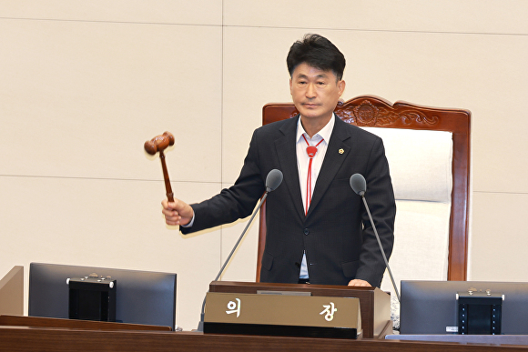 이양섭 충북도의회 의장이 28일 433회 임시회 1차 본회의에서 ‘충청북도 시·군의회의원 정수 등에 관한 조례 일부개정조례안’ 의결을 선언하고 있다. [사진=충북도의회]