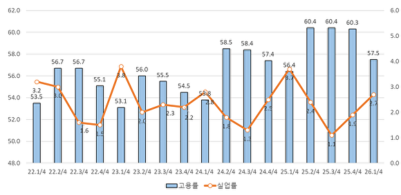 1분기(1~3월)는 추운 날씨로 인한 외부활동이 위축되고, 신규 채용 전 단계인 방학 시즌이 겹치며 취업자 수가 계절적으로 가장 적은 시기다.