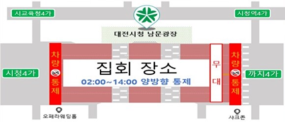 이번 집회는 1일 오전 9시부터 오후 1시까지 대전시청 남문광장 일원에서 개최된다. 또한 오전 11시 30분부터 12시 30분까지 약 1.9km 구간에서 도로 행진이 진행된다. 시는 행사 준비와 안전 확보를 위해 오전 2시부터 주변 도로가 단계적으로 통제한다. 또 도로행진 해당 구간도 순차적으로 통제한다.
