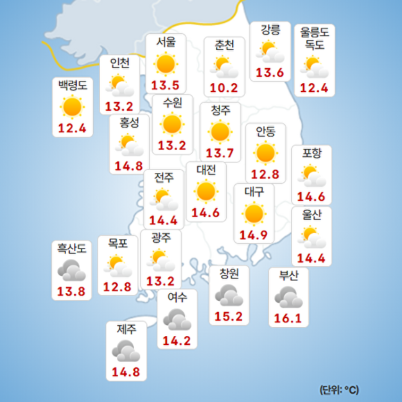 부산지방기상청에 따르면 이날 오전 9시 현재 주요 지역의 기온은 부산 16.1도, 울산 14.4도, 창원 15.2도로 기록됐다.
